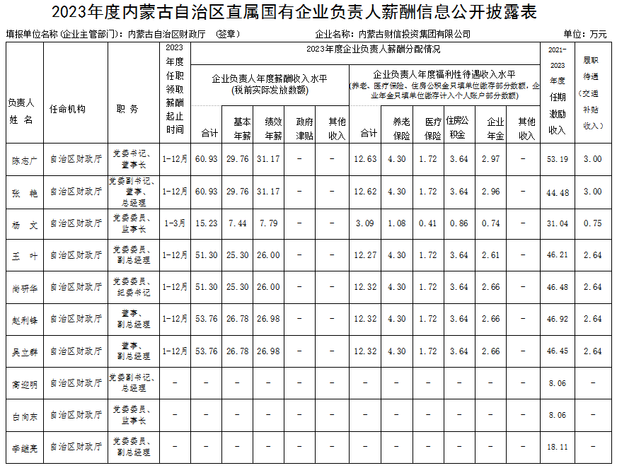 /* * @Descripttion: * @Author: chaimin * @Date: 2025-10-16 17:17:35 */ 2023年度内蒙古自治区直属国有企业负责人薪酬信息公开披露表 - 信息公开 - 内蒙古财信投资集团有限公司